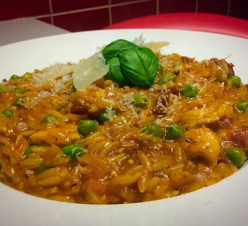 two chicken breasts cut into chunks, 200g tomatoes, tiny drop of oil, 1 large onion sliced finely, three garlic gloves, 400g of orzo pasta (or rice), 3 dollops of tomato puree, 900ml of chicken stock, 1/2tsp of oregano, 1/4tsp of thyme, 1/4tsp of lemon zest and 1/2tsp of balsamic vinegar. Basil leaves, black pepper and parmesan to serve.