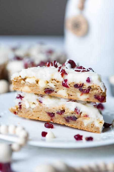 - To make the frosting, beat cream cheese and powdered sugar together with an electric mixer until smooth and creamy. Add 1/2 tsp orange extract and 1/2 tsp vanilla extract and mix well. Top cooled bars with frosting. Sprinkle with chopped Craisins and drizzle white chocolate over the top with a fork. I dip my fork into the chocolate then shake it gently over the top of the bars to create little streaks. You can either slice right away and enjoy, or place the bars in the refrigerator for about an hour (what I like to do) to help them set up before cutting. Cut into triangles and enjoy!