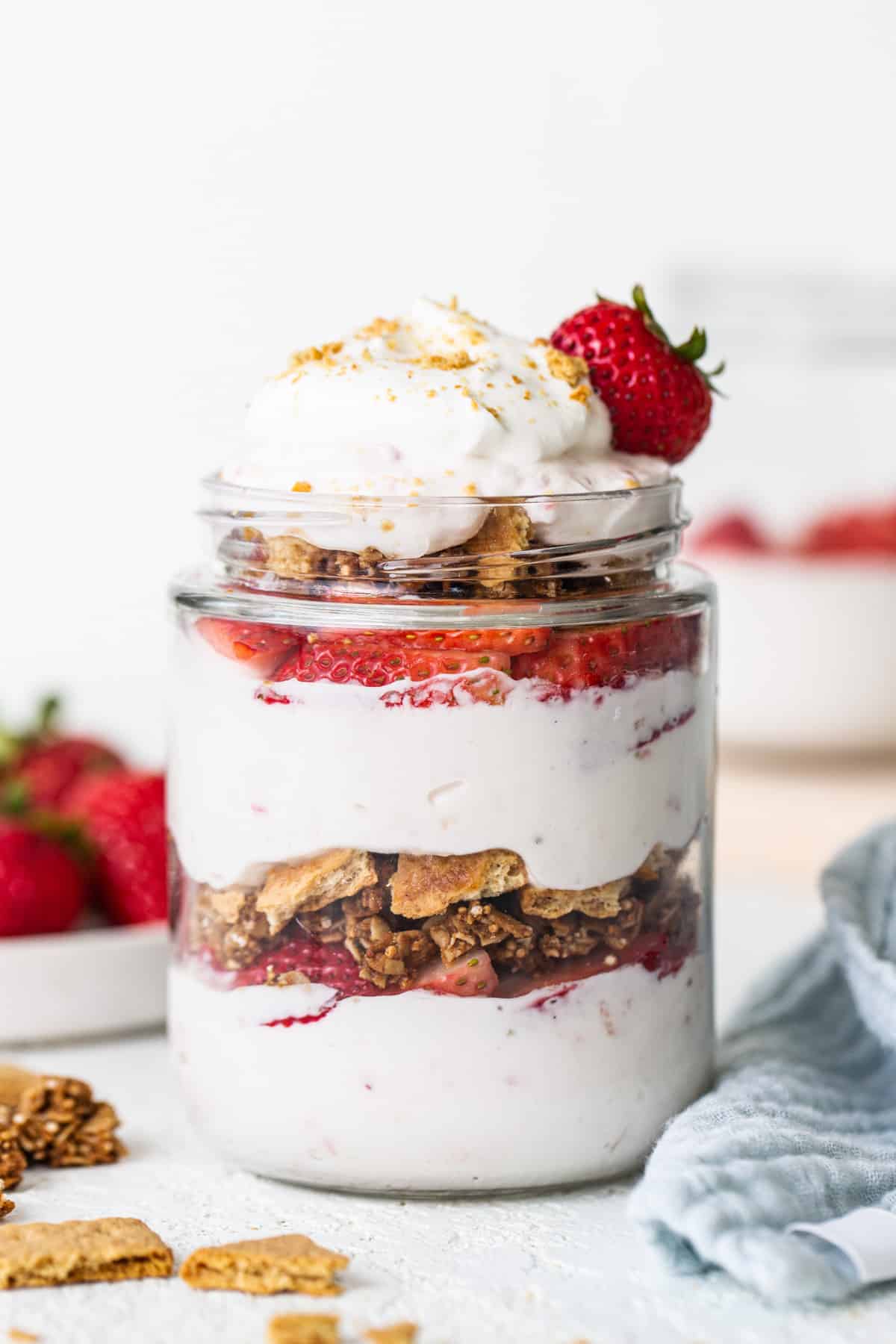 - Layer the cottage cheese mixture, strawberries, granola, and graham crackers in a jar.