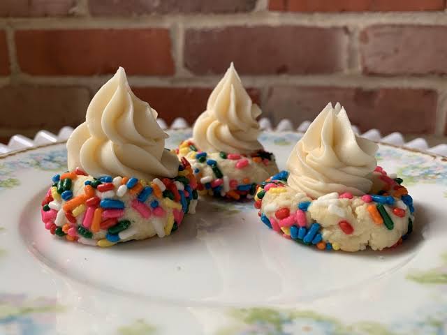 A delicious and tender thumbprint cookie rolled in jimmies then topped off with a pile of sweet buttercream frosting.