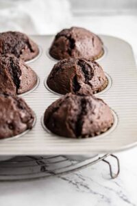 These muffins combine the best of both worlds with a tender, moist crumb and a deep chocolate flavor that’s sure to satisfy any sweet tooth.
