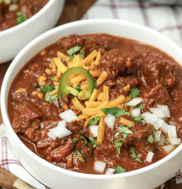 Unlike a classic chili recipe made with ground beef, this recipe doesn’t include beans. Serve it with a big ol’ chunk of cornbread or garlic bread for dipping.