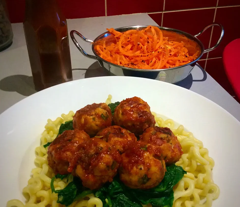 We cooked up some syn-free noodles and layered our plate with noodles, spinach and meatballs, with extra BBQ sauce on the top and those carrots on the side. You don’t need the carrots, but they’re a nice addition – we just had a surplus rattling around in the bottom of the fridge, so why not?